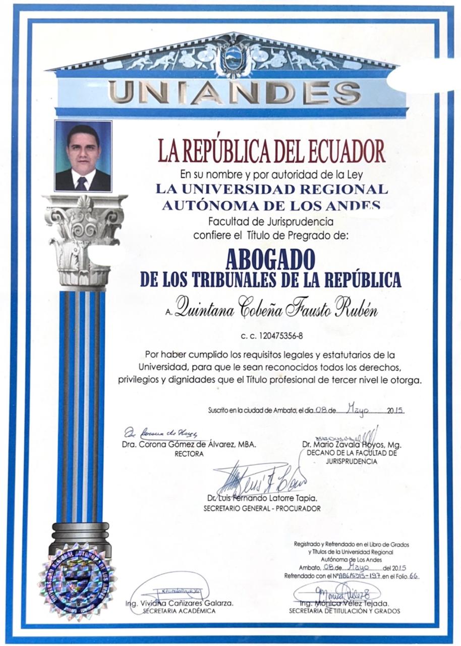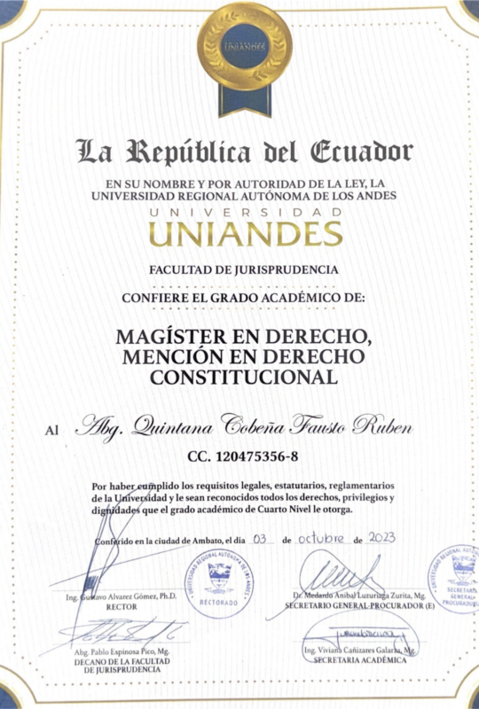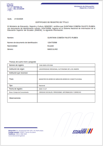 Soy abogado en libre ejercicio con formación de cuarto nivel como Magíster en Derecho con mención en Derecho Constitucional, lo que me permite analizar, interpretar y aplicar de manera directa la Constitución como norma suprema dentro del ordenamiento jurídico ecuatoriano.