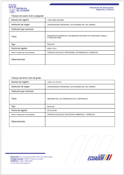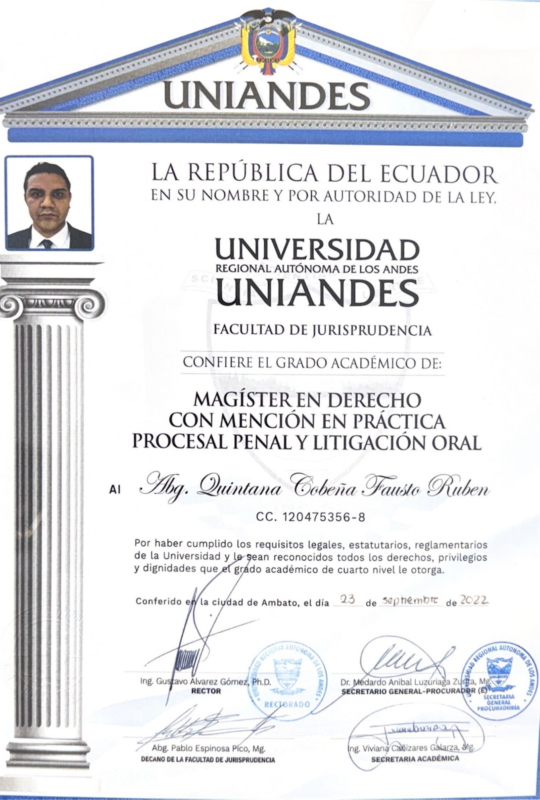 Soy abogado en libre ejercicio con formación de cuarto nivel como Magíster en Derecho con mención en Práctica Procesal Penal y Litigación Oral, lo que me permite ejercer una defensa técnica altamente especializada dentro del sistema penal ecuatoriano.