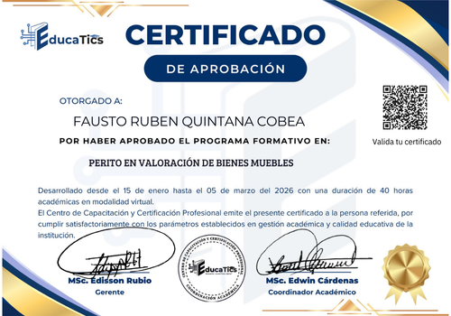 Cuento con certificación como Perito en Valoración de Bienes Muebles, con formación en la determinación técnica y comercial del valor de activos como vehículos, maquinaria y otros bienes, mediante métodos de valoración reconocidos.
